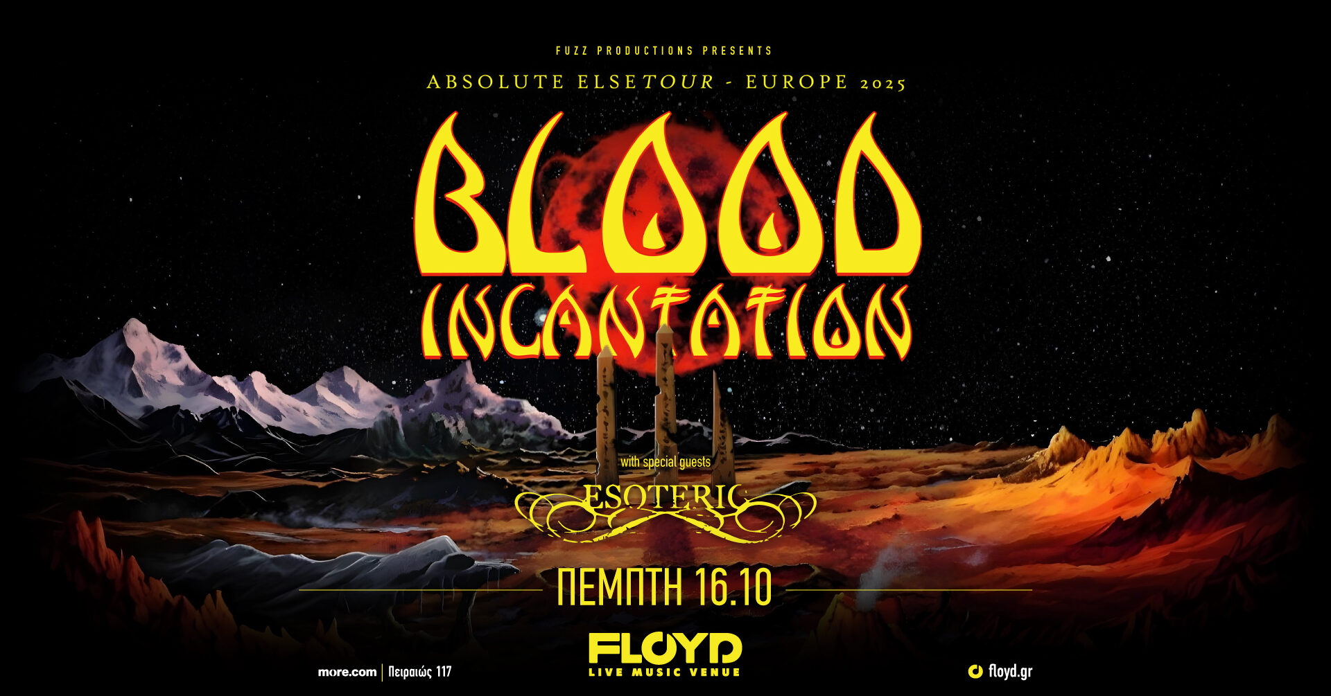 Progresif death metalin öncü isimlerinden Blood Incantation, funeral doom’un efsane gruplarından Esoteric ve sert tınılarıyla dikkat çeken Engulfed, metalseverlere unutulmaz bir sahne deneyimi sunmaya hazırlanıyor. Kendi türlerinde özgün ve çarpıcı örnekler sergileyen bu üç grup, sahnede bir araya gelerek performansın enerjisini zirveye taşıyor. Her biri kendine has müzikal üslubu ve yaratıcı yaklaşımıyla metal dünyasında özel bir yere sahip olan bu topluluklar, izleyicilere melodik detaylarla harmanlanmış güçlü ve agresif anlar sunacak. Yoğun sahne atmosferi, teknik ustalık ve yüksek enerjiyle bu gece, metal tutkunları için kaçırılmayacak bir deneyim olacak.